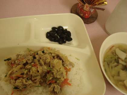 初日の献立は「他人丼、すまし汁、黒豆の煮もの、牛乳」です。「今年一年もまめに暮らせますように…」と、お正月料理の黒豆でスタートしました。