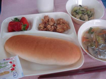 『ピリからあげ』は、子どもたちの好きな献立で必ず上位にあがる「鶏肉のからあげ」をアレンジしたもので、下味にコチジャンを加えました。『中華スープ』は、焼き豚、もやし、にら、生しいたけなど、中華の食材を使っています。『ほたて貝と野菜のいためもの』は、うま味のあるほたて貝柱とチンゲンサイなどをにんにくの風味をきかせて炒めました。それに、いろどりのよい『いちご』を組み合わせています。