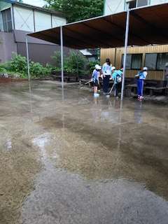カレーコンテストの結果発表前に、皆んなで力を合わせて後片付けをしています。
