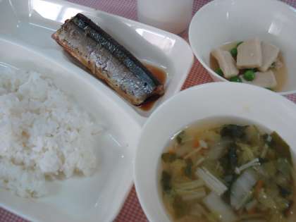 今日の給食は、甘辛いたれに山椒の香りをきかせた「さんまのさんしょう焼き」に「すまし汁、高野どうふの煮もの」を組み合わせた純和風の献立でした。