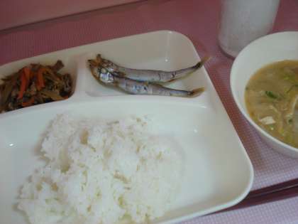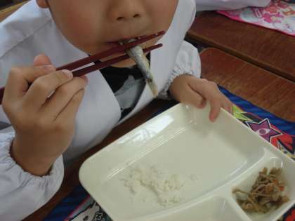 今日の給食は「ごはん、牛乳、焼きししゃも、みそ汁、きんぴらごぼう」でした。ししゃもを初めて口にした1年生もいたようです。