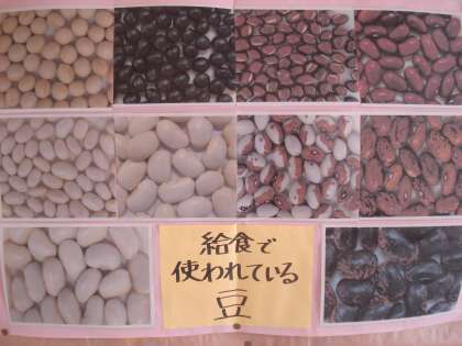 豆の歴史は古く、弥生時代の遺跡から小豆のタネが発見されているそうです。また、世界には18000種類もの豆があり、このうち食用に使われるのは70種類ほどだそうです。大阪市の学校給食では上の写真の通り、10種類の豆を使っています。さて、いくつ知っていますか?