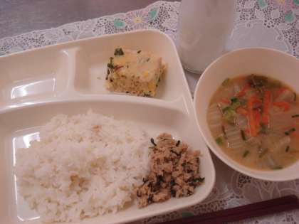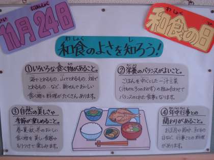 今日、11月24日は、日本の伝統的な食文化について見直し、和食文化の保護・継承の大切さについて考える「和食の日」(いい(11)日本食(24)の語呂合わせ)です。給食も「ごはん、千草焼き、みそ汁、ツナっ葉いため、牛乳」の和食献立でした。