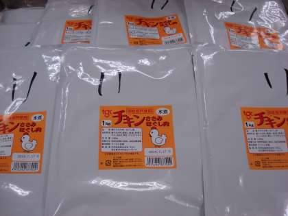 前回までは、鶏挽肉を使っていましたが、今回は新食品の「ささみ(水煮)」を使いました。蒸したささみをほぐし、野菜やきのこなどでとったスープとともにレトルトパウチされたものです。(写真中)ささみは脂肪が少なく淡白な風味があります。形が「笹の葉」に似ているので、この名前がつけられました。
