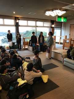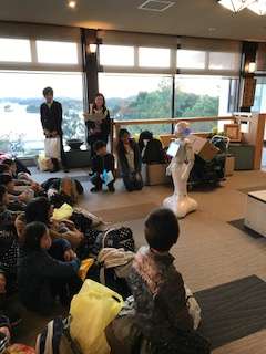 みち潮さんから、ご挨拶をいただいた後、ロボット「ペッパーのかしこちゃん」からホテルのでの諸注意を聞いています。