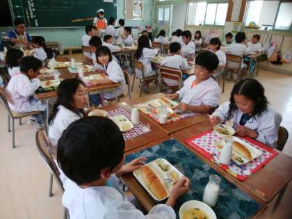 給食では水煮缶詰やトマトピューレ、トマトジュースなどで年間を通して使用していますが、5〜10月は生のトマトを月に1回使うことができます。今回は、旬の熊本県産の生のトマトを鶏肉、たまねぎ、えのきたけ、にらといっしょに、しょうがの風味をきかせて溶き卵で仕上げた「トマトと卵の中華スープ」(卵除去食もあり)にしました。