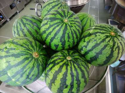 給食では毎年7月に「すいか」をデザートとして出しています。今日は、鳥取県産の大きなすいかを13玉使いました。すいかは中心部が一番甘いため、できるだけおいしさが均等になるよう独自の切り方で1玉を64に切り分けました。
