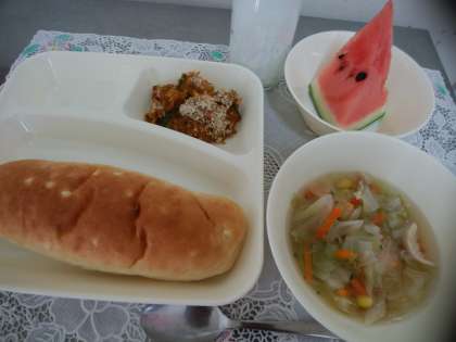 給食の前後には「給食のすいかをきのうから楽しみにしててん」「くだものの中で、一番すき」「きのうも家で食べたけど毎日食べたい」「お代わりが4つしかなかったけど、ぎりぎりgetできてん」とすいか談義に花が咲きました。給食でのすいかを初めて食べた1年生も「あまくておいしかった」と好評でした。