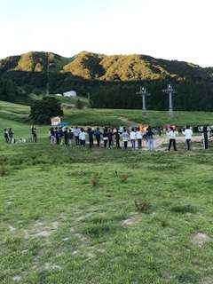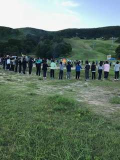 火の神様が登場した後、みんなの中心に炎がともりキャンプファイヤーが始まりました。みんな楽しくスタンツを行なっています。