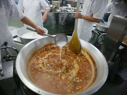 給食のハヤシライスは、給食室で小麦粉をサラダ油やバターで褐色にいためて作ったブラウンルウでとろみを出しています。今回のハヤシライスは、アレルギー対応サポート月間ということで、水溶きにした米粉を使用してとろみをつけています。そのため、小麦アレルギーのある子どもたちに配慮した献立となっているとともに、油の使用量が少ないためにあっさりとした味わいとなっていました。