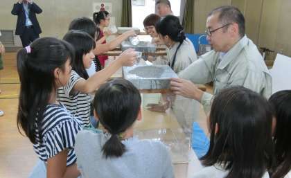 平板ブロックの実験では、水をかけると水が染み込むブロックや、そのままのブロックの違いを体験し、水たまりのできにくい道作りの工夫について学びました。