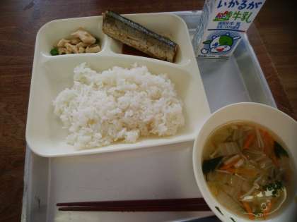 今日の給食は、毎年10月に登場する「さんまのさんしょう焼き」です。香ばしく焼いたさんまに、砂糖・みりん・こい口しょうゆ・さんしょう(粉末)を合わせたたれをかけたものです。