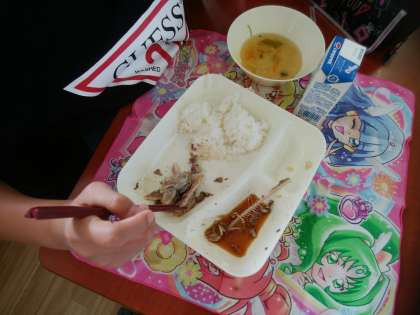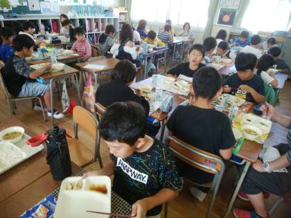 教室では慣れない骨付きさんまを目の前にし、「骨も全部食べられるやろ!」と言いながら丸かぶりしている子もあれば、上手に骨をとっている子、悲壮感漂う表情で悪戦苦闘している子もいました。さんまを食べた後は「このたれもおいしいからご飯にかけて食べよ!」と最後の1滴まできれいに平らげている姿に思わず笑みがこぼれました。