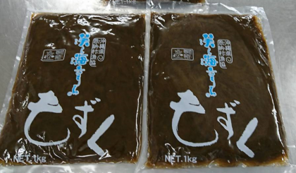 給食で使うもずくは沖縄県産のオキナワモズクの冷凍品で、給食室で流水解凍して使用しています。ジューシーの他、スープやヒラヤーチー(お好み焼きに似た沖縄料理)などに使っています。