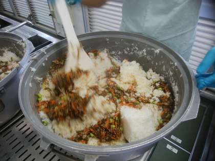 「ジューシー」とは、沖縄の方言で「炊き込みご飯」や「雑炊」のことをさし、「フーチバ(よもぎ)ジューシー」、「クーブ(昆布)ジューシー」などがあります。給食では、もずくの他に豚挽肉や切りこんぶなどの具を豚骨スープで煮、たきたてのごはんに混ぜています。