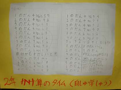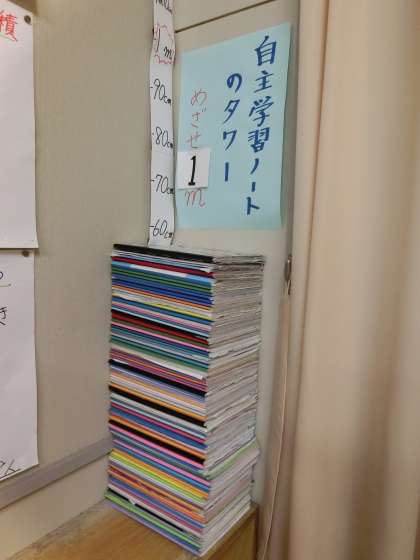 1年生は、音読や計算カードなど、2年生は九九を時間を計って唱えたり、3年生はノートのまとめや、4年生は理・社を中心としたノートのまとめ、5年生は、算数のステップアッププリントを解いたり、6年生は、終わった自主学習ノートを積み重ねタワーにするなど、各学年の発達段階に応じた様々な学習に取り組んだものを、紹介し合いました。