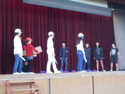 2学期最後のなかよし集会で、健康委員会による「かぜ・インフルエンザに負けないぞ」の劇とクイズを行いました。