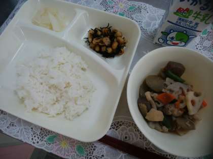 もうひとつのおかず「筑前煮」に使ったごぼうやれんこんなどとともに「よくかんで食べる給食」でもありました。