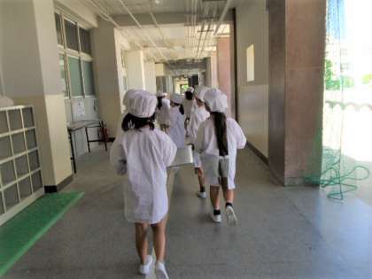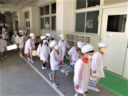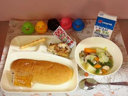 ツナ・とうふ・細かくカットした大豆・たまねぎ・でんぷんを混ぜ合わせ、砂糖・塩・こいくちしょうゆで味付けし、焼き物機で焼いた献立です。1人1袋ついたケチャップをかけていただきました^^