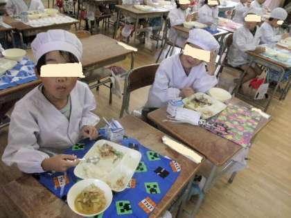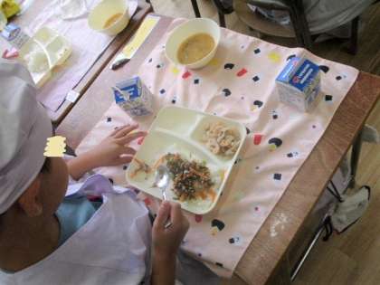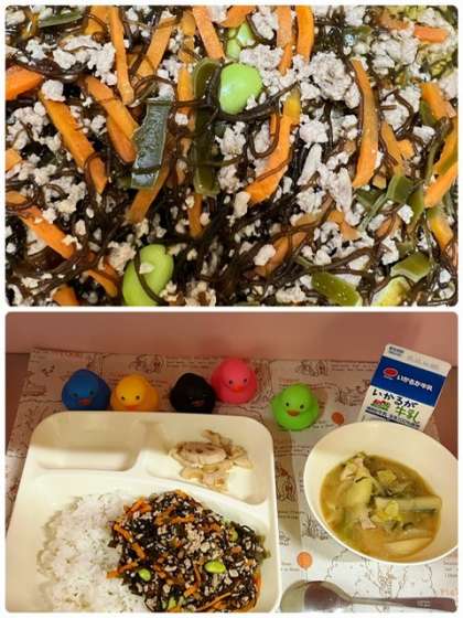 給食のジューシーは、豚ひき肉・むきえだまめ・もずく・切りこんぶなどを使った炊き込みごはん風でした。