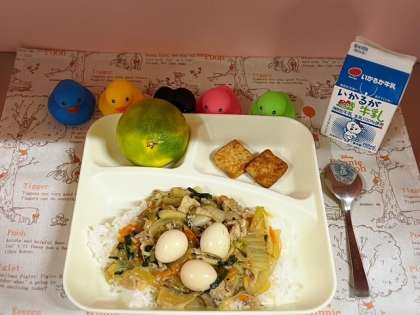 豚肉、うずら卵、はくさい、たまねぎ、たけのこ、にんじん、しいたけ、青みにニラを使用しています。この献立は【うずら卵】の除去食対応献立で、卵アレルギーのある児童の分はうずら卵を入れる直前に取り分け、専用の容器で提供しました。