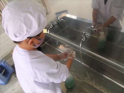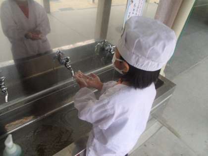 昨日、3年生がおそうじしていた手洗い場で、1年生がせっけんできれいに手を洗っていました😊