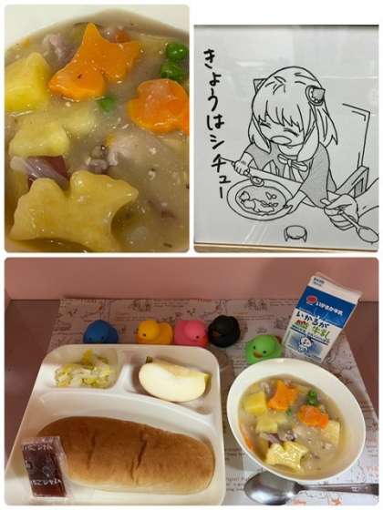 また給食室のサンプルケースの前には、調理員さんが書いたイラストがさりげなく置かれていて😊、それを見た子どもたちは口々に「めっちゃ上手!すごい!」と驚いていました。