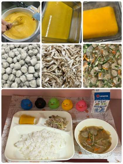 今日の給食は、いわしだんごとだいこん、ごぼう、にんじん、青ねぎなどが入った汁物です。魚のすり身なので、骨や歯を丈夫にするカルシウムが含まれています。