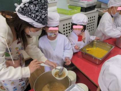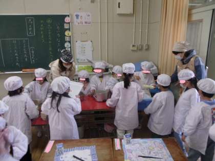 1年生の教室では、つみれ汁担当の児童が、入れ方のお手本を
