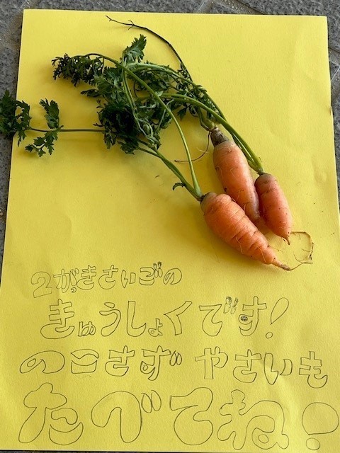 写真のかわいいにんじんは、学習園で間引きされたもので、W先生が子どもたちにメッセージを書いて、給食室に飾ってくれました♪