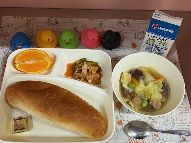 今日の給食では、牛肉やウインナー、じゃがいも、キャベツ、にんじん、えだまめを使っています。