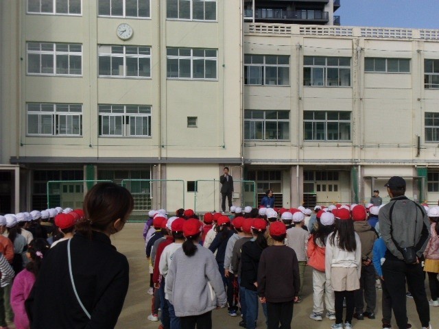 児童朝会では、少しでもなくすために、できることをすること、廊下や階段は歩くこと、公園ではルールを守って遊ぶことも大切だという話をしました。
