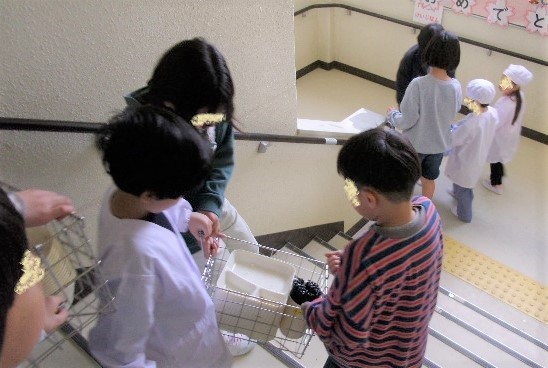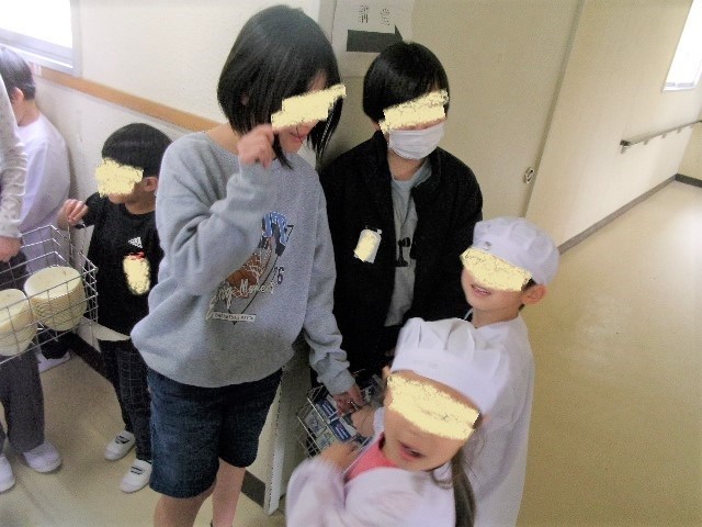給食が始まって3日目。今日は6年生に付き添ってもらって給食を取りにいった1年生。