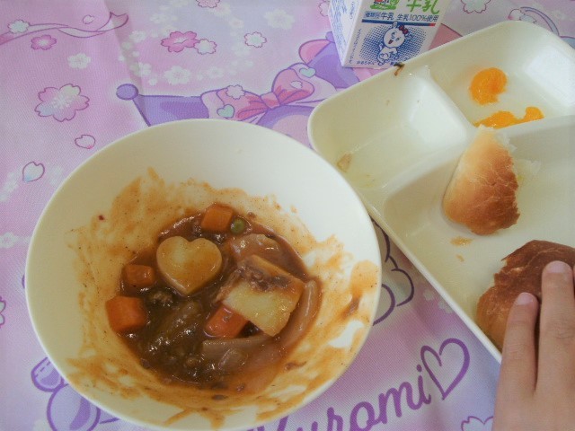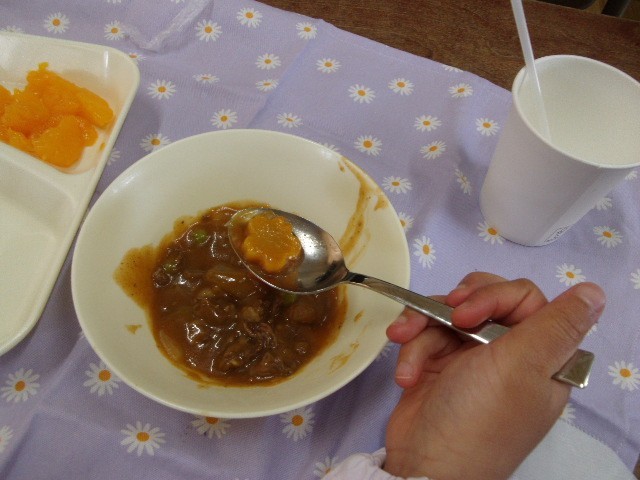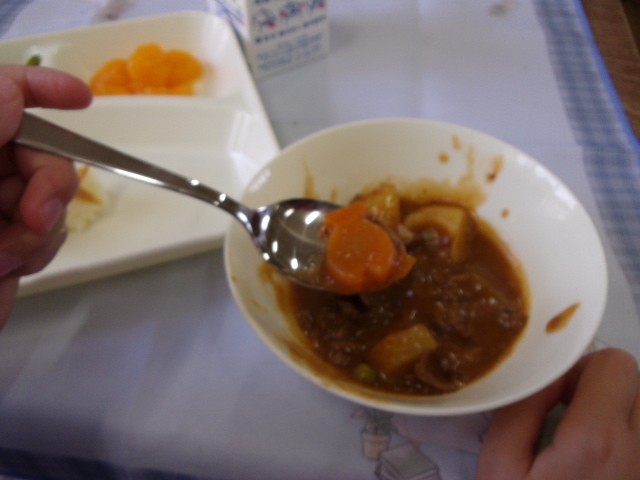 先日のカレーライスに続き、今日のビーフシチューにもたくさんのラッキーにんじんやラッキーじゃがいもが入っていました。1年生はとても喜んでいて、食べてしまうのがもったいないから、と最後まで大事に取っておく子がたくさんいました^^