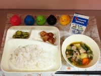 入学・進級のお祝い献立・カツカレーライス(米粉カツ・カレー)・フルーツゼリー・牛乳------------------------給食が始まって2日目。今日はみんな大好きカレーライスの日でした。調理員...
