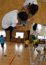 1年生の団体競技、『たまいれ』の様子です。 1年生にとってはとても高いところにあるカゴの中へ、一生懸命に入れようとしている姿がかわいいですね!
