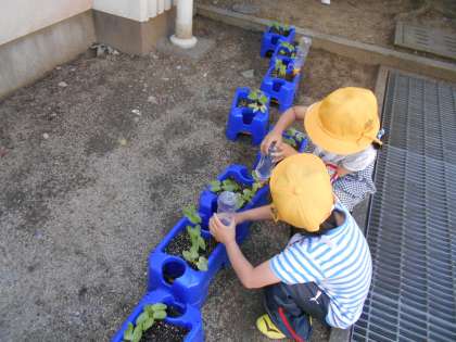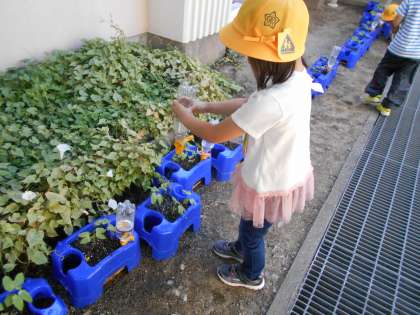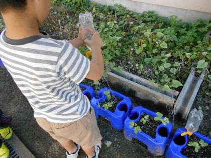 今朝も1年生は、アサガオのお世話をしてあげていました。