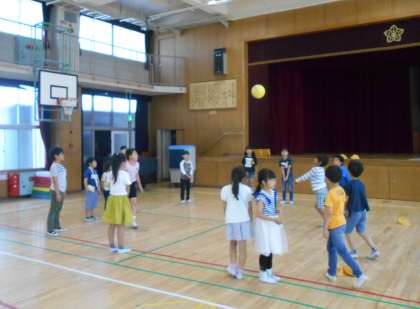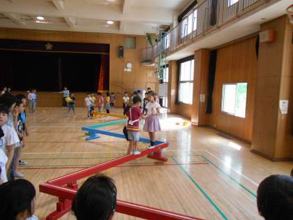 講堂では、『バレーボール』や『ジグザグ1本橋』で遊んでいました。
