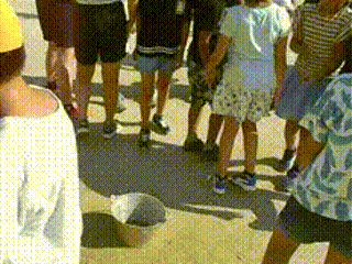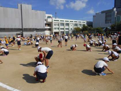 運動場での運動会練習を前に、みんなで石を拾いバケツに集めました。