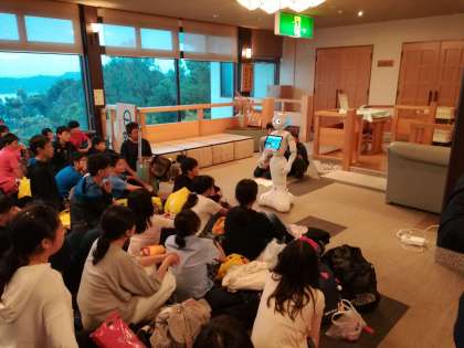 宿舎に着きました。ペッパーのかしこちゃんから利用にあたっての諸注意を聞きました。みんな真剣に聞いていました。