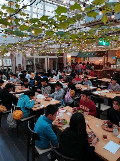 もくもくファームで、昼ごはん中です。バイキングを楽しんでます。