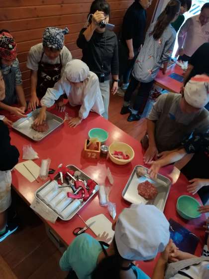 ソーセージ作り、進行中です。お肉を手でもんで混ぜ合わせます。