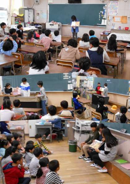 今朝のにこにこ班活動は、講堂が作品展準備中で使用できないため『読み聞かせ!』となりました。