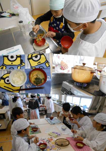味噌汁は『かつお節』からだしとっていました。みその分量を量り、上手にだし汁で溶いていました。だしがとてもいい匂いなので、まだ3時間目だというのに、もうおなかがすいてきました。