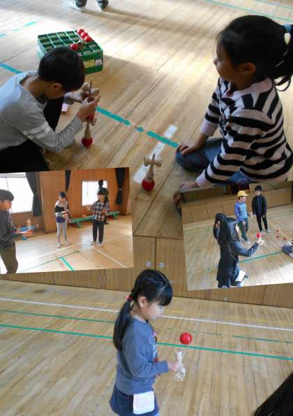 難しいけん玉の技に挑戦している児童がたくさんいました。