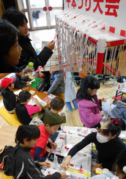 講堂には、割りばし鉄砲や千本つり大会、手づくりツリーコーナーなどがありました。
