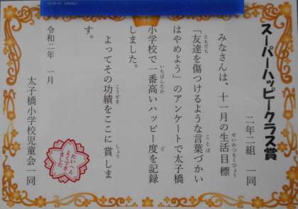 11月に取り組んだ『友だちを傷つけるような言葉づかいはやめよう!』の生活目標を達成するための6つのキーワード『わかめとかき』がどれぐらいできたかをチェックする『ハッピーチェック』の集計結果、優秀だったクラスの表彰がありました。