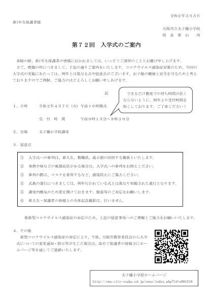 『第72回 入学式のご案内』