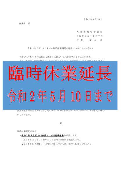 令和2年5月10日までの臨時休業期間の延長について(お知らせ)