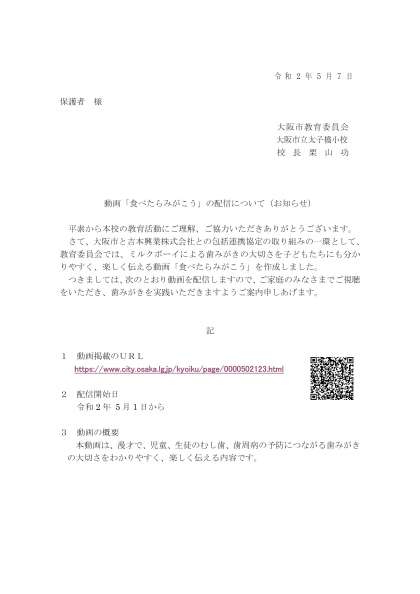 詳しいことは、下の『動画「食べたらみがこう」の配信について(手紙)』をクリックしてご確認ください。